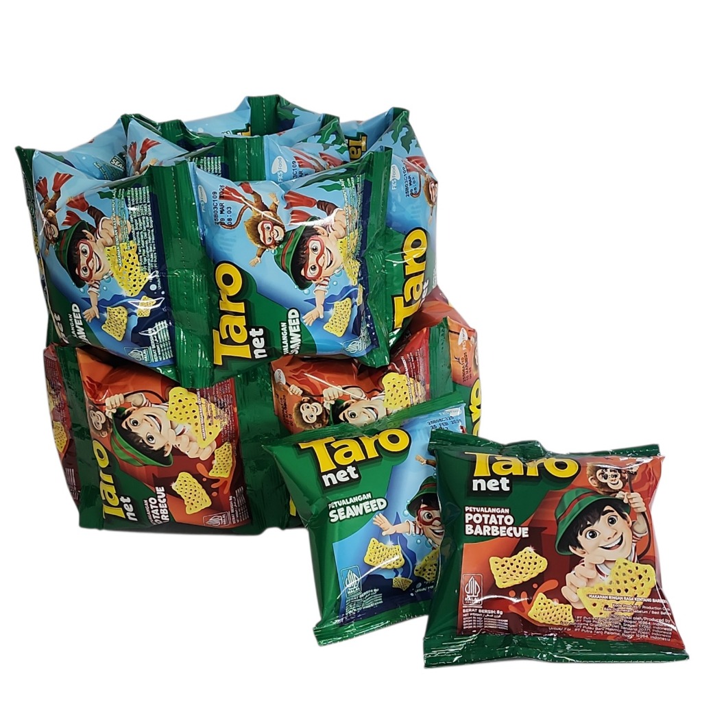 Taro Net, makanan ringan berbentuk seperti jaring. Bernetto 9 gram. Ber BPOM dan Halal MUI. dijual per renceng isi 10 bks