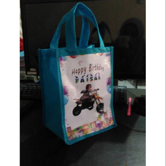 Tas ultah, bahan kain spundbond + baner full colour,, size 15x10x20 cm..