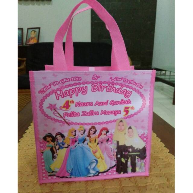 Tas souvenir ultah dengan kombinasi kain spunbond 75gr dan bahan banner yg membuat ultah putri putri menjadi tambah menyenangkan.