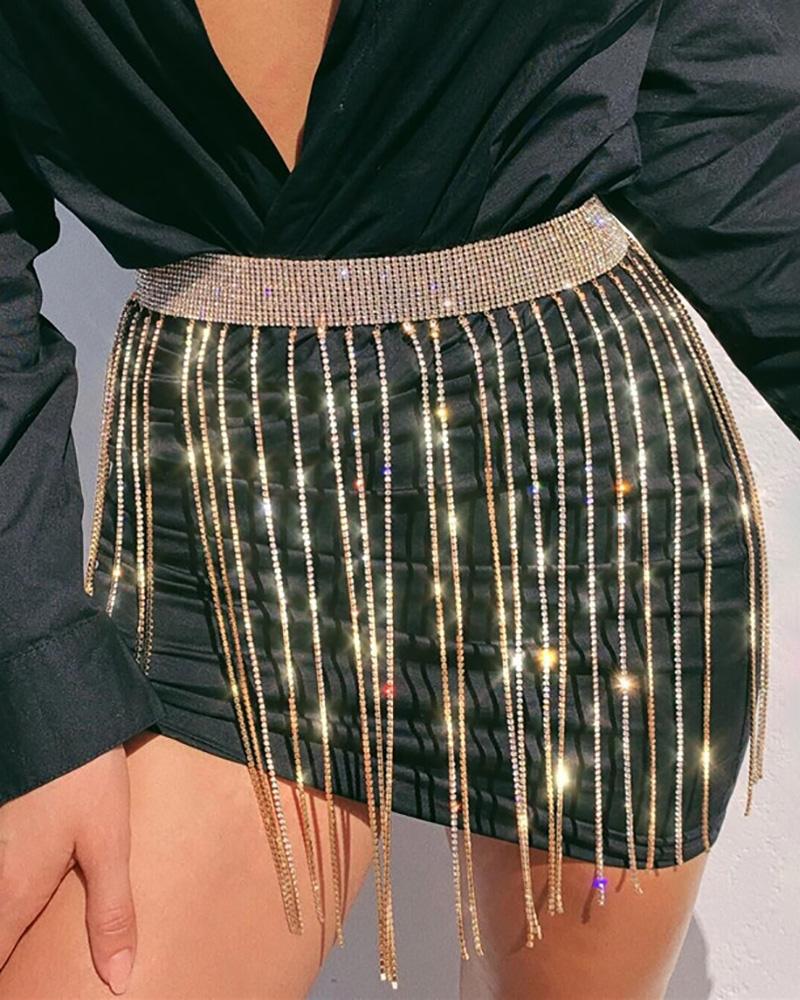 Tassel Design Rhinestone Decor Waist Chian, Gold