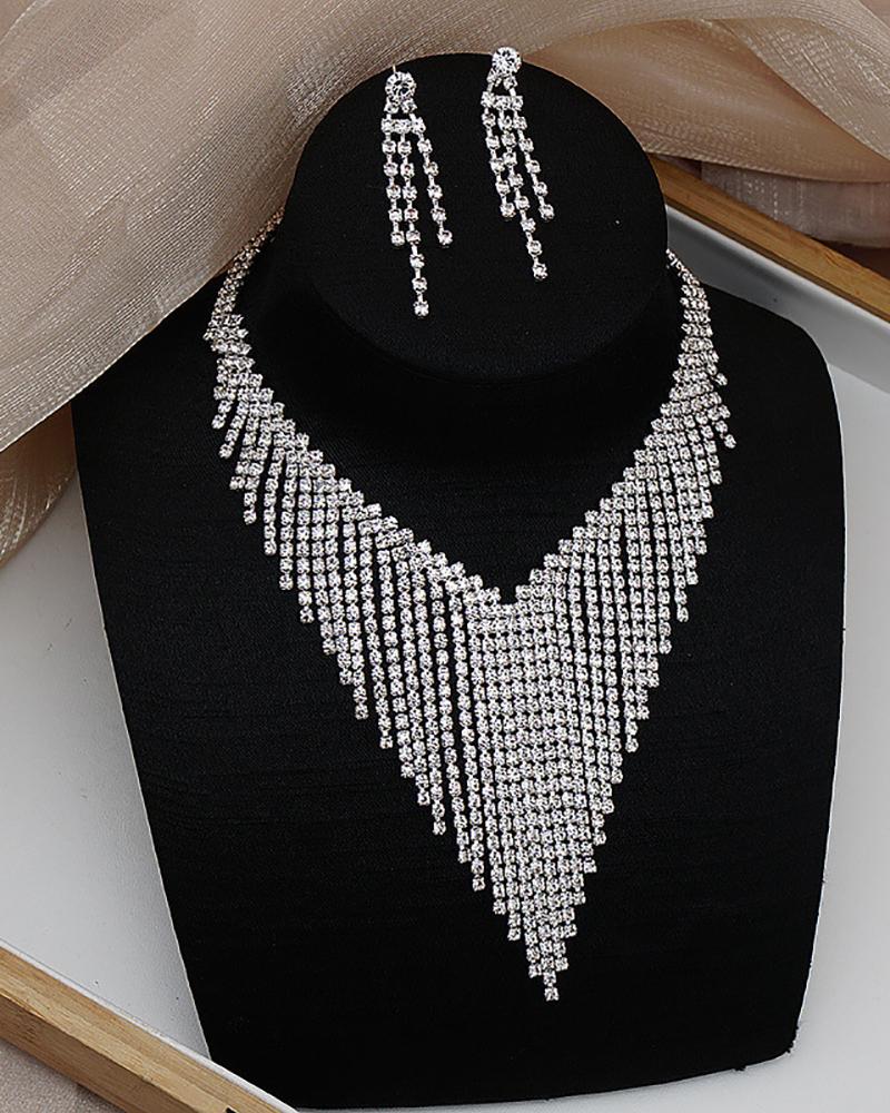 Tassel Design Rhinestone Earrings & Necklace Jewelry Set, Silver