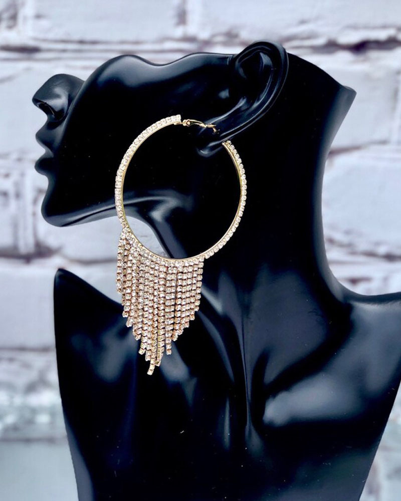 Tassel Design Rhinestone Hoop Earrings, Gold