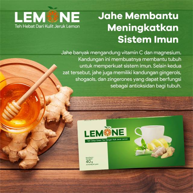 Teh celup green tea dengan perpaduan kulit jeruk lemon, jahe dan serai.