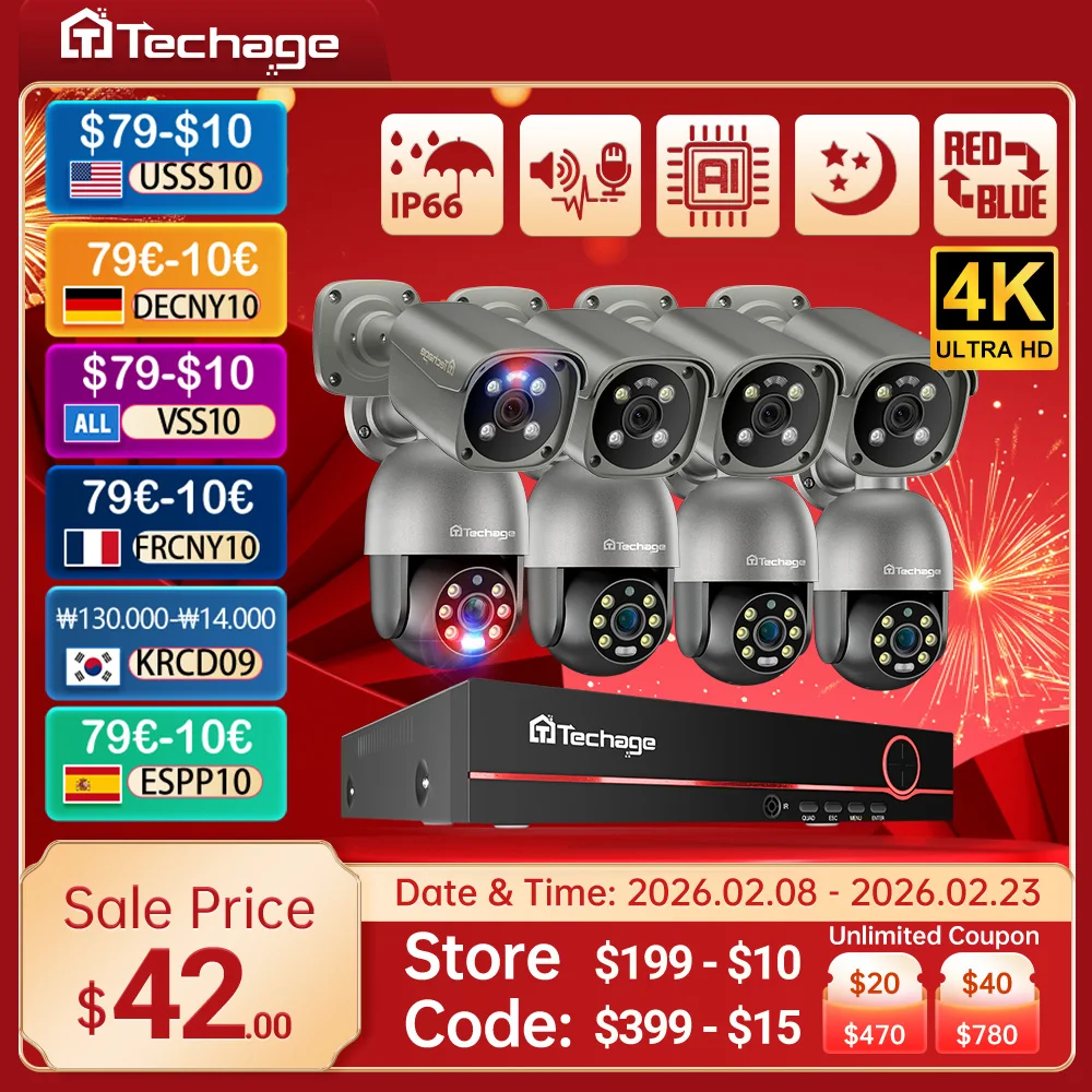 Techage 8CH 8MP 5MP Security Camera System Night Vision Human Detection POE PTZ Camera Outdoor Security Surveillance P2P System
