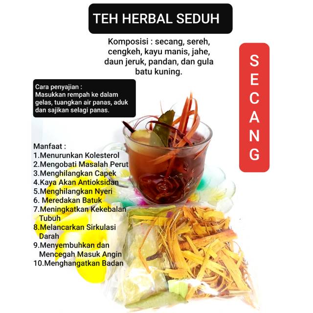 Komposisi : secang, sereh, cengkeh, kayu manis, jahe, daun jeruk, pandan, gula batu kuning.