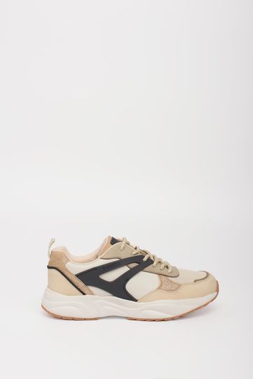 Tenis de estilo urbano confeccionada en poliuretano combinado con un mix de materiales, en tonos blancos y arena con detalles de contraste en negro. Moderna y combinable, es un básico para complementar distintos tipos de looks.