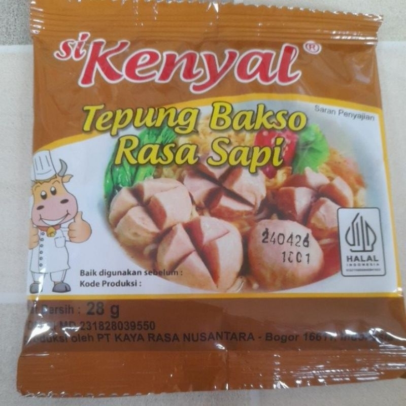 Tepung bakso merk si Kenyal adalah tepung pengganti daging sapi dalam pembuatan bakso serta meningkatkan aroma dan rasa daging sapi. Bersertifikat halal dan pertama di Indonesia. Mengapa harga tepung bakso ini lebih mahal dari produk sejenis? Karena selain merenyahkan, mengenyalkan, tepung ini memiliki kelebihan meningkatkan aroma dan rasa khas sapi, meningkatkan jumlah adonan sehingga jumlah butiran bakso yang dihasilkan lebih banyak dibandingkan dengan penggunaan tepung lain. Cara penggunaan: