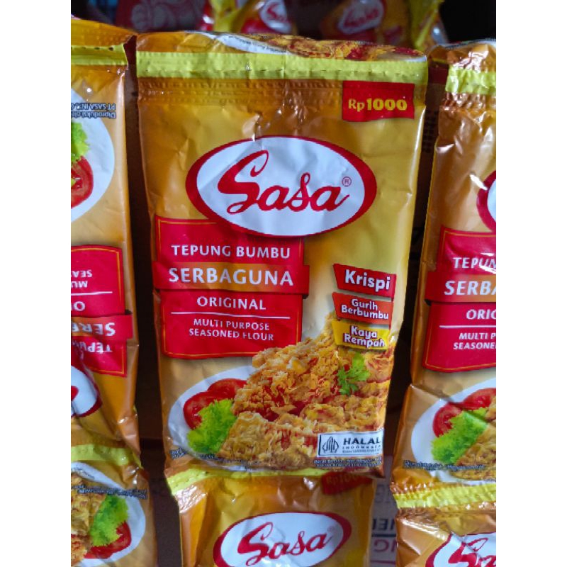 Tepung bumbu serbaguna SASA menggoreng jadi mudah dan pasti enak,kemasan ekonomis harga 1000/bks. dalam 1 renteng isi 10 bks x 32 g. exp 2026