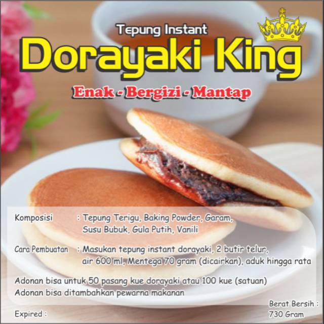 1 (satu) bungkus tepung Dorayaki KING dapat dibuat 50 rangkap kue Dorayaki atau 100 kue Dorayaki satuan