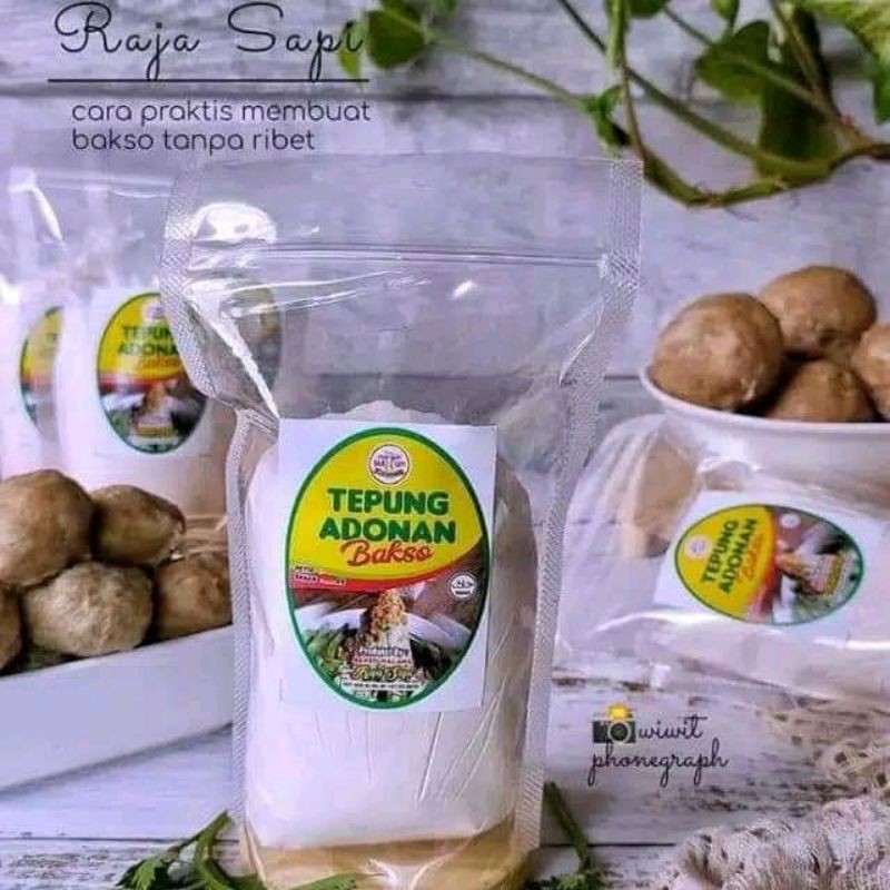 Tepung Bakso RAJA SAPI (Adonan Lengkap) tidak perlu bumbu tambahan lagi. Bikin Bakso semakin mudah dengan Tepung Bakso RAJA SAPI(Adonan Lengkap), tidak perlu repot repot lg mencampur pengenyal bakso, menghitung takaran saji tepung dll.. Bikin sendiri bakso yang enak, sehat dan gak pakai ribet untuk keluarga anda. Tepung adonan bakso yang mudah dan ringkas anti gagal dengan hasil maksimal cocok untuk yang mau buka usaha bakso, frozen bakso maupun rumah tangga. Komposisi : Tepung Tapioka, pengembang. Serat gandum, penstabil. Petunjuk Pemakaian: 1. Campurkan 1 bungkus dengan 1,5 kg daging (sapi/ayam/ikan) yang digiling kasar 2. Tambahkan 400 gr es batu dan giling kembali sampai halus 3. Bentuk adonan dan masukan ke air hangat 4. Rebus hingga mendidih dengan api sedang. Cocok untuk berbagai macam bakso isi, seperti bakso urat, bakso isi telur, tahu bakso, dll. Tidak diperlukan campuran lain, hanya daging dan es batu.