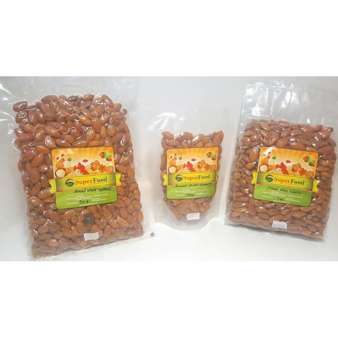 Kacang Almond utuh - raw impor dari USA. Banyak protein dan dapat menahan nafsu makan. Sangat cocok untuk Diet dan Kesehatan. Dapat langsung dikonsumsi atau sebagai bahan tambahan pada coklat, cereal dll.