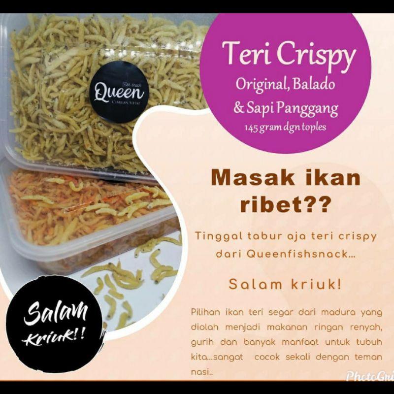 teri crispy terbuat dari ikan teri segar pilihan dari madura yg diolah menjadi makan ringan,renyah,gurih & banyak manfaat untuk tubuh kita..sangat cocok sekali untuk teman nasi..