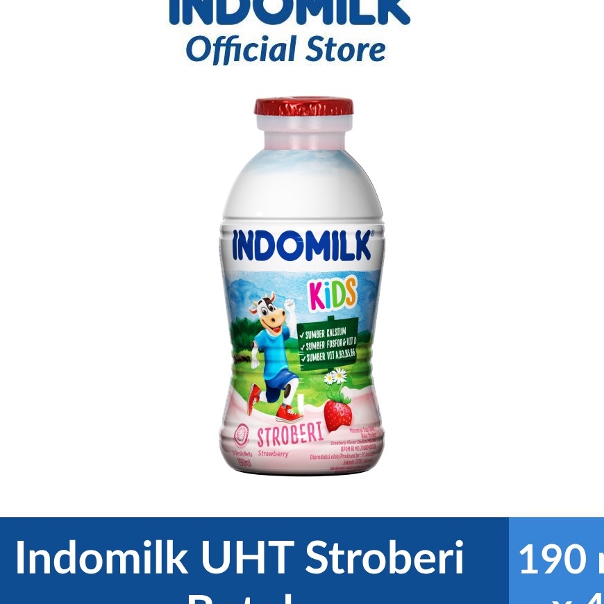 Susu Cair Botol Indomilk rasa Strawberry adalah susu steril siap minum yang telah disterilisasi dengan temperatur tinggi untuk menjaga kandungan nutrisi penting bagi pertumbuhan anak (Tinggi Kalsium, Fosfor dan Vitamin D). Dikemas dengan botol plastik transparan yang kedap udara dan tanpa bahan pengawet. Susu Cair Botol Indomilk cocok untuk anak di atas 1 tahun. Setelah kemasan dibuka, direkomendasikan segera dihabiskan. BPOM MD 200809030116, Shelf Life: 7 Bulan