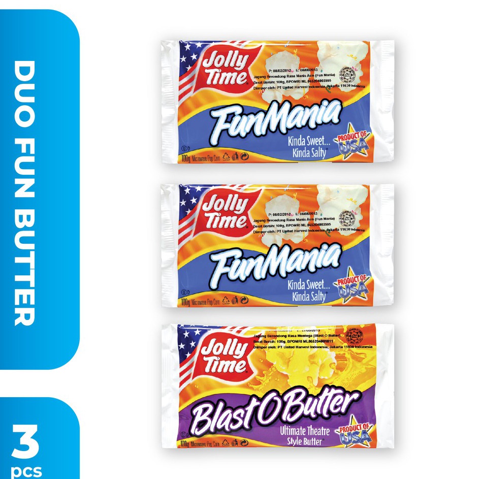 Terlaris Jolly Time - Paket Duo Fun Butter (2FM, 1BOB) - Mircowave Popcorn SH-30-11-23 Paket Duo Fun Butter : 2 Porsi (serving) Microwave Popcorn Gourmet rasa manis dan asin seperti di karnival-karnival dan 1 porsi Popcorn mentega terbaik kami dengan gaya popcorn bioskop dengan rasa ekstra mentega dalam 1 paket. Berat Bersih 100gr/pcs Panduan Mudah Memasak Jolly Time Microwave Popcorn: bungkus plastic dan masukan bungkus popcorn dgn posisi “This Side Up” menghadap ke atas (JANGAN TERBALIK UTK PELETAKAN NYA!) h tombol pemanasan yg tertinggi di microwave anda (Setiap Microwave memiliki pemanas yg bervariasi) waktu masak sesuai petunjuk. Mallow Magic 2.20 detik dan Rasa Lainnya 2.30 (dgn microwave 800Watt) lalu tekan tombol “START”. Untuk cancel memasak tekan STOP. Jika Microwave anda LOW Watt (dibawah 800W) membutuhkan waktu memasak yg lebih lama antara 3-5 menit tergantung dr Watt microwave yg anda miliki. owave akan memasak Popcorn secara otomatis Sekitar 2-3 Menit. lah matang buka bungkus Popcorn. HATI- HATI! Panas dan ber Uap! (Khusus Mallow Magic : Tambahkan Bumbu Flavour dan Aduk di dalam kantong Popcorn nya dgn rata. mat Menikmati!! Nikmati microwave popcorn terlaris yang terbuat dari biji jagung & bumbu USA terbaik ini. Anda dapat merasakan renyahnya popcorn yang segar & lezat sampai gigitan terakhir dan anda pasti akan ingin makan lagi dan lagi! There is nothing better than having a deliciously simple snack in an exciting day. The Jolly Time Simply Popped Popcorn will make every movie the best ... GLUTEN FREE! Exp. DATE DIATAS 4 Bln Jam Pengiriman kami : * Sameday : Sebelum Jam 13.00 (Senin - Jumat), Sebelum Jam 11.00 (Sabtu) *Instant, Next Day dan Regular : Sebelum Jam 15.00 (Senin - Jumat), Sebelum Jam 13.00 (Sabtu). *Hari Minggu dan Hari Libur Nasional Kami tidak ada Pengiriman. - Fast respon jam kerja Senin - Sabtu pukul 8.00 - 16.00, Minggu atau hari libur Off - Mohon mencantumkan warna/gambar/varian pilihan dan cadangannya (jika ada) di kolom pemesanan ya. Jika tidak mencantumkan pilihan, maka akan kami kirimkan sesuai stok yang ready!!! - Pengiriman pada Hari yang sama (malamnya). - Jika barang yang di pesan kosong dan tidak ada respon selama 1x24 jam maka akan di kirim secara random. - Periksa kembali NOMOR HP (TELP) & ALAMAT LENGKAP. Guna mempercepat dan memperlancar pengiriman. - BARANG YANG SUDAH DI BELI TIDAK BISA DI KEMBALIKAN. - Gudang kita ada di Beberapa Alamat Jabodetabek... Jadi pengiriman tidak selalu sesuai alamat toko ini yaaa.. >>>> MEMBELI = SETUJU