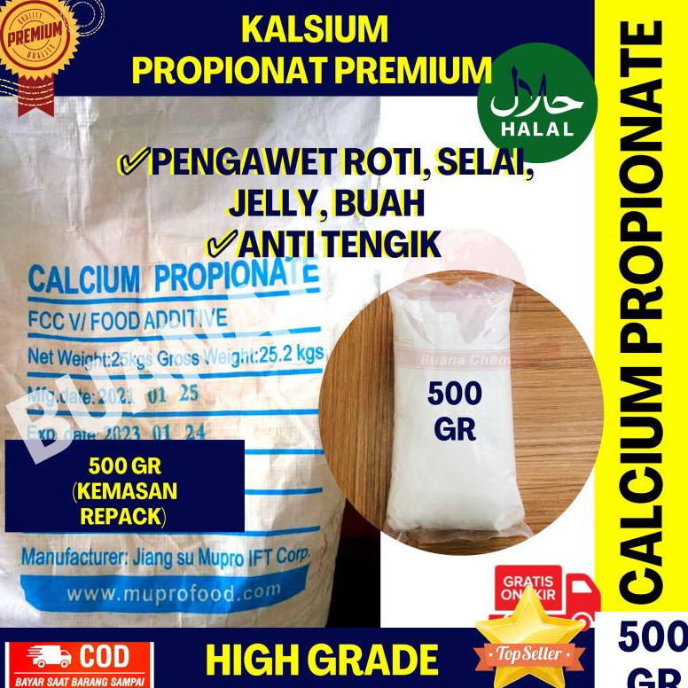 BUDAYAKAN MEMBACA SEBELUM MELAKUKAN PEMBELIAN Hai kak produk kita sudah restock Pasti sudah tahu kan Terlaris.. Calcium Propionate 500 gram / Pengawet Roti / Anti Tengik RKD kesukaan kalian semua ini? Serba murah Calcium Propionate 500 gram / Pengawet Roti / Anti Tengik ‼️‼️Silakan pilih extra packing jika memakai ekspedisi. produk botol, serbuk maupun cairan di jirigen rentan bocor, penyok, tumpah, pecah saat di ekspedisi. Produk makanan seperti coklat, dll juga mudah meleleh karena ekspedisi. Kerusakan di ekspedisi bukan tanggung jawab penjual. TIDAK MENERIMA KOMPLAIN ATAU RETUR. MEMBELI BERARTI MENYETUJUI. KHUSUS GOSEND/GRABSEND tidak perlu memakai extra packing & tidak akan mendapatkan extra packing. ‼️‼️ Jika ada komplain wajib menyertakan video unboxing paket sebelum dibuka tanpa edit/ cut (Keterabgan sudah tertera pada bungkus paket)‼️‼️ ✅Berat : 500 GR (kemasan repack) ✅MUPRO premium ✅HALAL ISO 22000 Kalsium propionat termasuk dalam golongan asam propionat yang sering digunakan untuk mencegah tumbuhnya jamur atau kapang. Juga berfungsi sebagai pengawet makanan basah (yang kandungan air nya cukup tinggi) seperti roti dan bolu. Kelebihan calcium propionate dibanding sodium benzoat: calcium propionate tidak membutuhkan pH yang rendah untuk mengawetkan makanan Bahan pengawet ini biasanya digunakan untuk produk roti dan tepung, keju, selai, jelly buah-buahan. Takaran pemakaian : 1. Makanan berbahan tepung terigu. maksimum : 0,32% atau 3,2 gram/kg bahan. 3. Makanan berbahan keju. maksimum : 0,3% atau 3 gram/kg bahan. 4. Selai dan jeli buah-buahan dengan pemanis buatan. pemakaian sampai 0,1 % atau 1 gram/kg bahan. Propionat efektif terhadap kapang dan beberapa khamir pada makanan dan minuman dengan tingkat keasaman pH di atas 5. Untuk kemasan Zak Asli Pabrik 25 kg silakan cek etalase / hubungi admin Sebelum Melakukan pemesanan, Mohon untuk baca dulu ya. >>>> MEMBELI = SETUJU