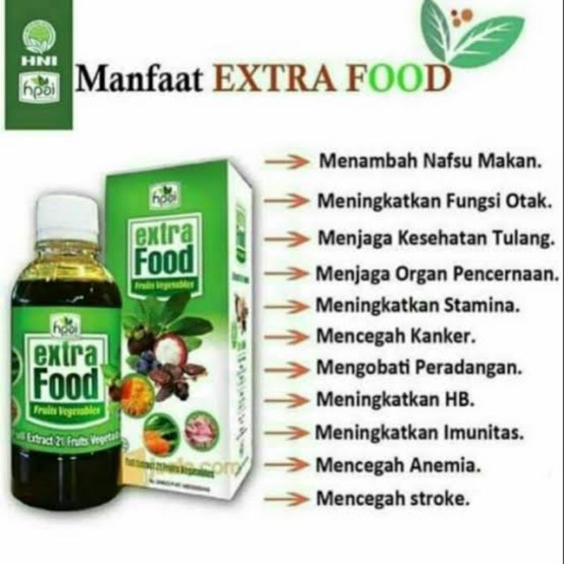 Extra Food HPA (formulator Extra Fruit ) adalah makanan kesehatan herbal alami tradisional dalam sebuah minuman dengan komposisi extraks sinergi dari 21 buah dan sayuran. Extra Food di formulasikan sebagai suplemen berkhasiat untuk mengatasi berbagai penyakit menjaga stamina dan kesehatan tubuh manusia. Extra food kaya dengan serat, vitamin dan nutrisi alamiah.