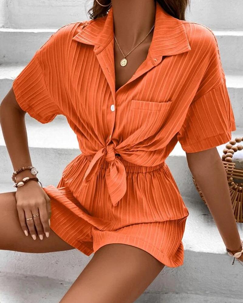 Textured Buttoned Top & Shorts Set, Orange