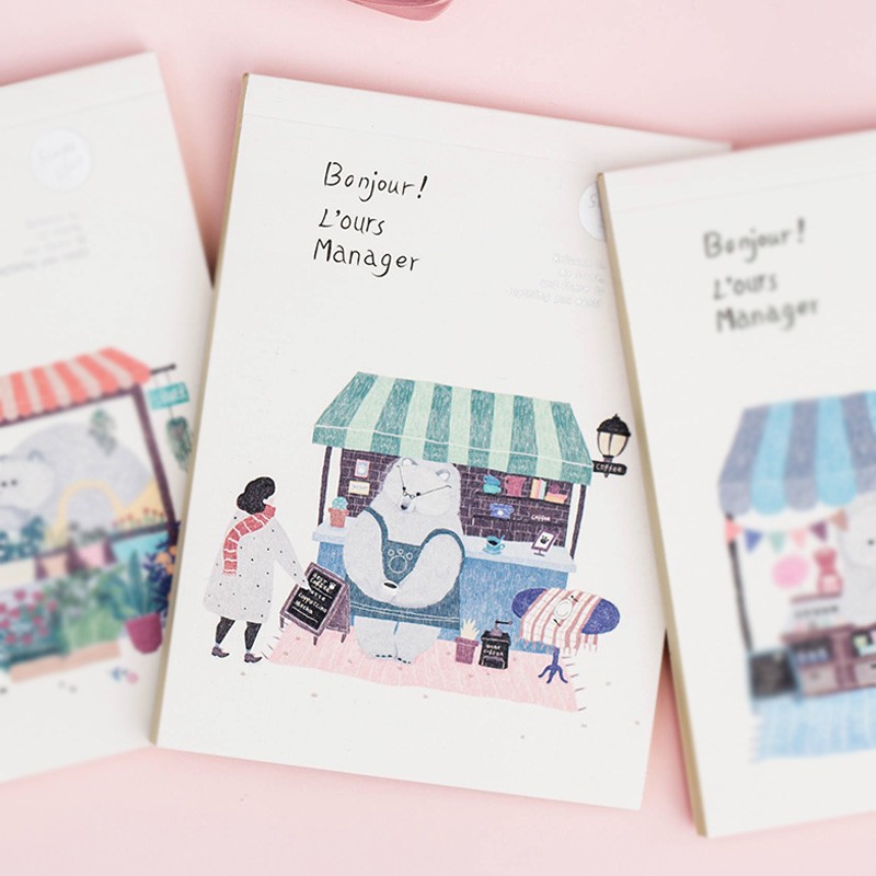 Buku tulis putih polos dengan gambar beruang besar yang lucu di depannya. Buku ini cocok untuk dijadikan buku sketsa maupun catatan. Dijilid dengan lem sehingga tidak mudah lepas dan rusak