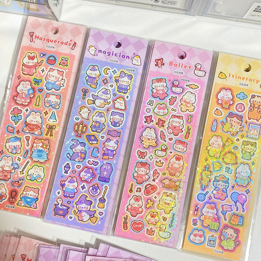 Dari balerina sampai penyihir, kumpulan kucing dan kelinci ini akan membuatmu gemas dengan pose dan outfit mereka yang beragam. Stiker kertas berukuran mungil ini cocok digunakan untuk menghias catatan dan jurnalmu. Satu lembar stiker berisi puluhan stiker mini karakter dan objek dengan cutting-an kiss-cut yang memudahkanmu untuk mengambil tiap stikernya.
