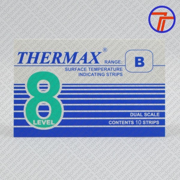 Thermax 8 Range B Level Strips dengan 2 skala pengukuran temperatur (Celsius & Fahrenheit) Murah dan Mudah Digunakan dengan Sistem pengukuran suhu yang cepat, akurat, dan sederhana. Menggunakan teknologi perubahan warna serta tahan terhadap Minyak, Air dan Uap.