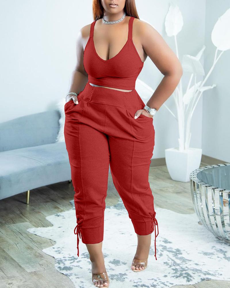 Thin Strap Crop Top & Eyelet Lace-up Pants Set, Red