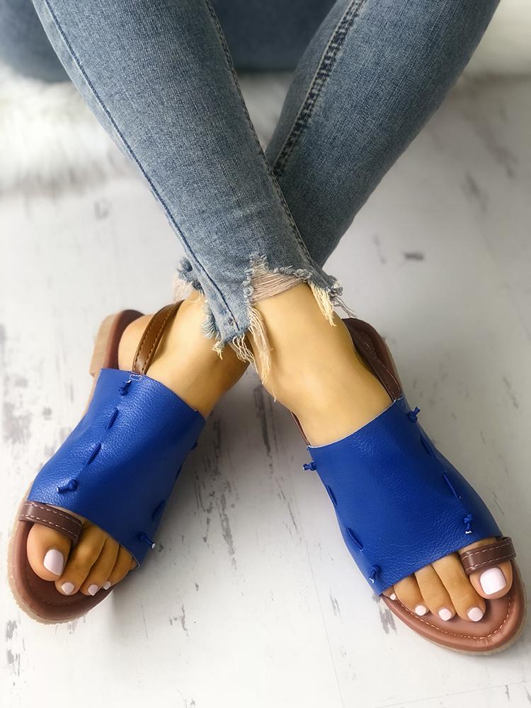 Thread Design Toe Ring Buckled Flat Sandals, Blue