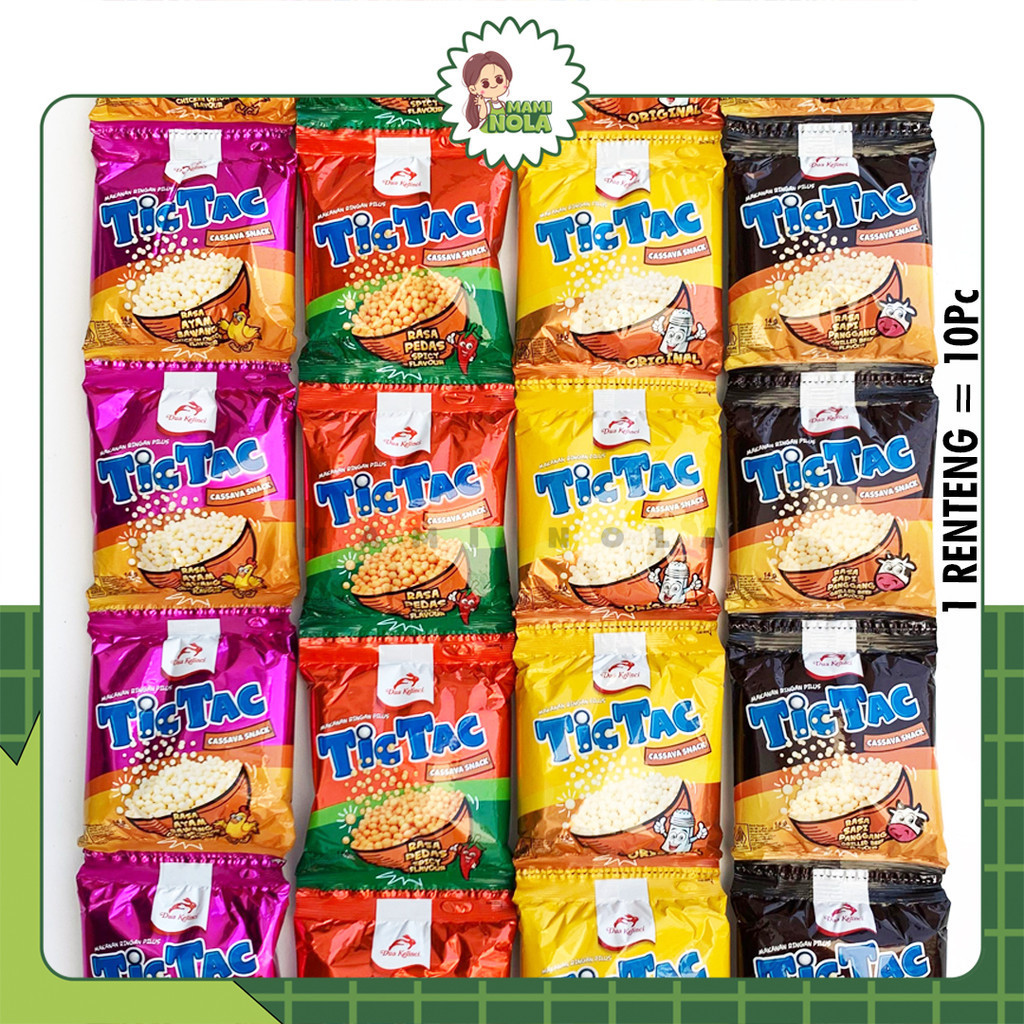 Tic Tac adalah snack campuran yang mengandung sembilan rasa yang berbeda, termasuk empat Tic Tac, kacang polong, dan marning. Kombinasi rasa yang berbeda dan teksturnya menciptakan sensasi rasa yang unik, lezat dan seru.