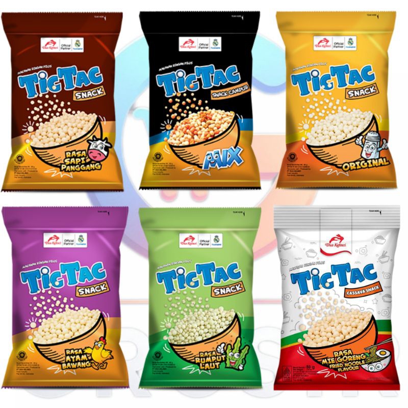 TicTac merupakan snack berbentuk bulat yang terbuat dari tepung tapioka dengan rasa barbeque yang lezat dan renyah.