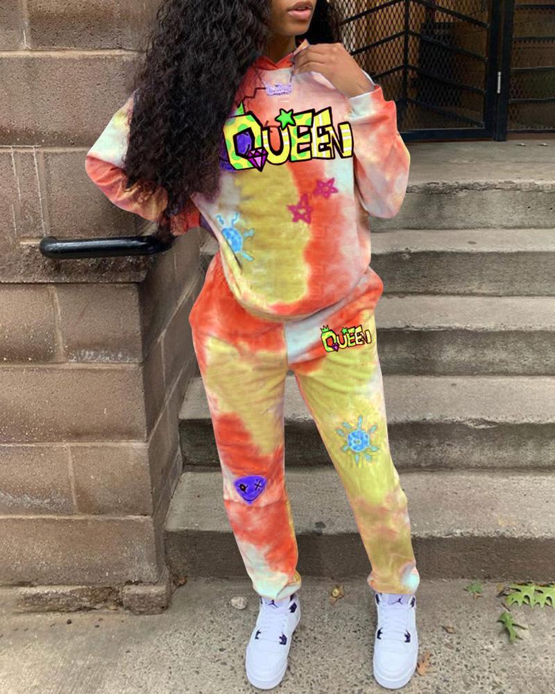 Tie Dye Letter Hooded Sweatshirt & Pocket Design Pants Set, Pink