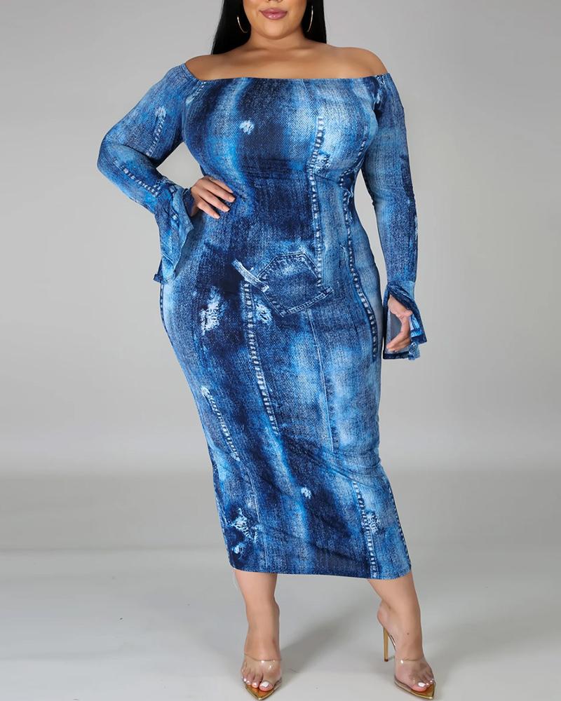 Tie Dye Off Shoulder Split Flared Sleeve Ripped Work Dress, Blue
