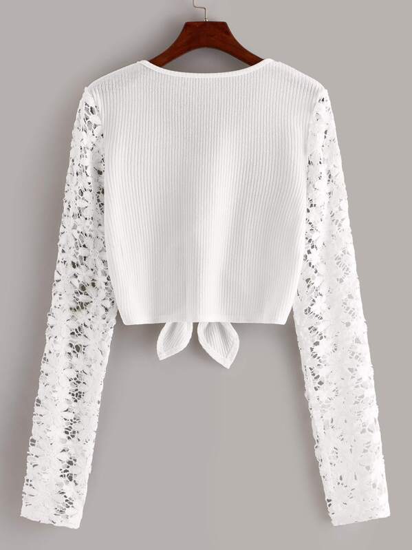 Tie Front Button Detail Guipure Lace Sleeve Sweater, White