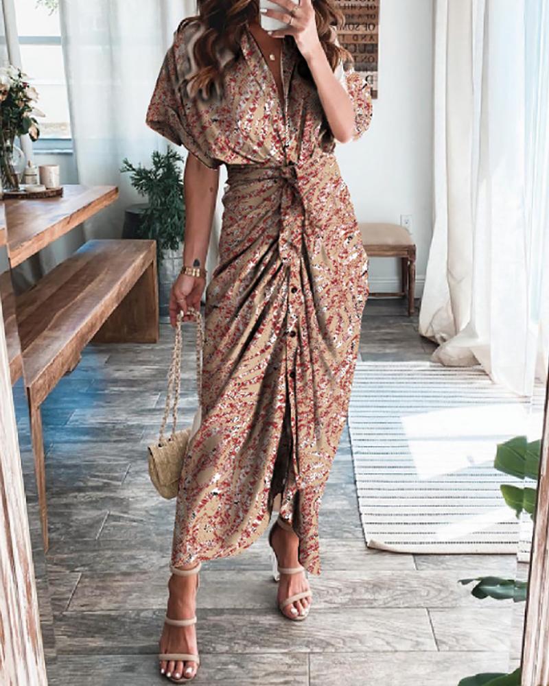Tie Front Ruffles Ruched Button Design Colorblock Dress, Style3