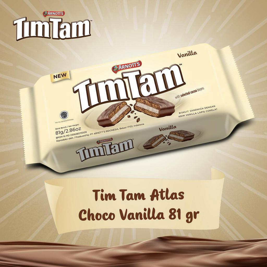 Tim Tam Atlas Choco Vanilla 81 gr adalah biskuit dengan kombinasi 3 lapisan yang sempurna - krim lembut di antara dua biskuit renyah, dilapisi cokelat nan nikmat. Krim Vanilla yang terbuat dari bahan-bahan berkualitas membuat rasa lebih enak dan menggoda di mulut. Kelezatannya begitu terasa sampai gigitan terakhir. Lebih nikmat lagi, jika dinikmati bersama teh atau kopi.