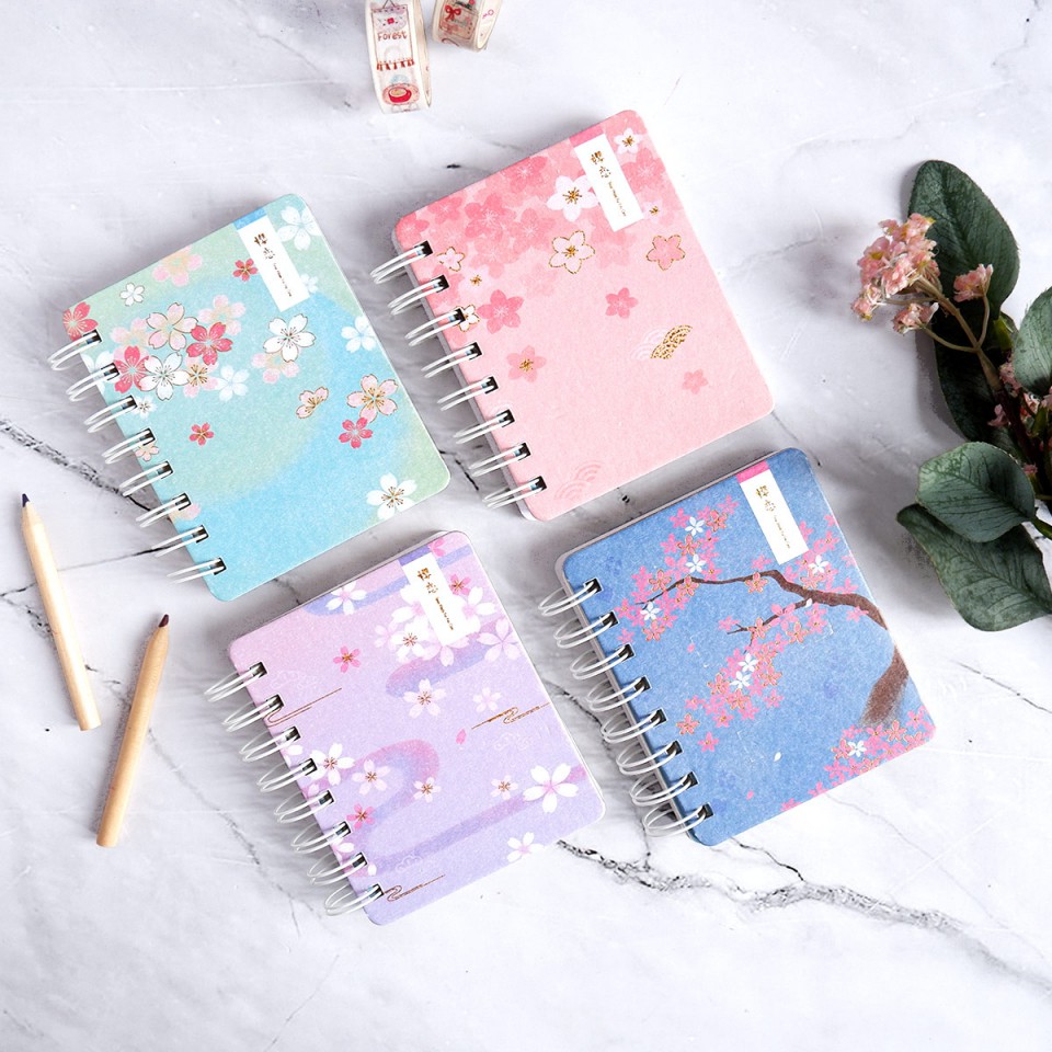 Buku mini ini pas untuk diselipkan ke dalam saku baju sebagai catatan portabel sehari-hari. Tema ilustrasi pohon Sakura didekorasi dengan tinta keemasan dan latar warna-warni pastel, memberi kesan indah dan sejuk.