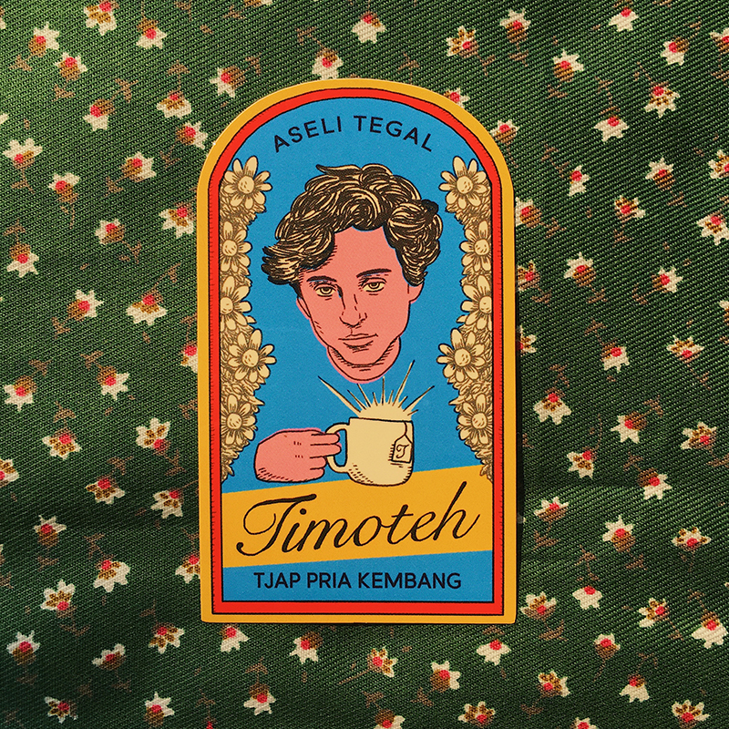Gambar tempel bergambar merek minuman Timoteh tjap Pria Kembang. Ada kemungkinan bisa menghilangkan kehausan sesaat bagi yang melihat.