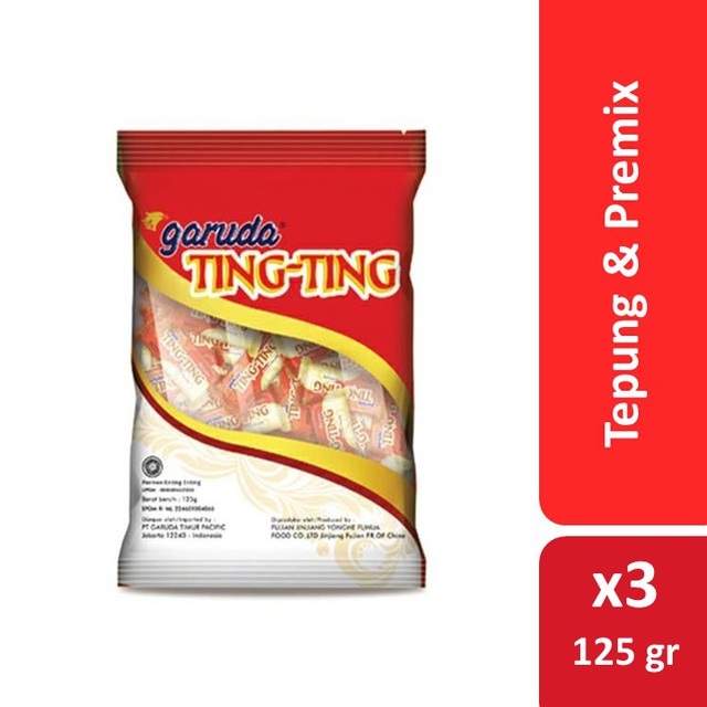 Ting-Ting Garuda 125gr x3 merupakan permen salut kacang manis yang diproses dengan higienis sehingga terjaga kualitasnya. Ting-Ting Garuda nikmat dijadikan cemilan sembari mengisi waktu luang.