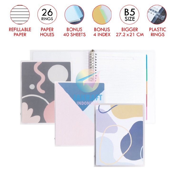 - Keterangan: Binder note untuk loose leaf ukuran B5 dan 26 rings, cocok untuk pelajar, mahasiswa hingga profesional. Sudah termasuk bonus kertas divider 5 index dan kertas loose leaf