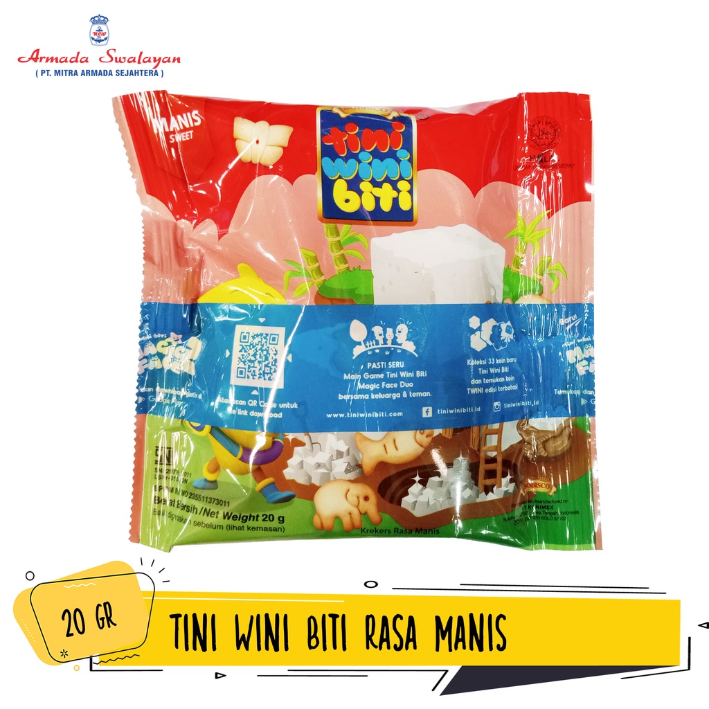 Biskuit anak Tini Wini Biti merupakan biskuit warna-warni dengan bentuk binatang yang imut, enak, dan bergizi. Menggunakan pewarna alami yang aman dikonsumsi. Biskuit warna-warni dengan 5 bentuk binatang.