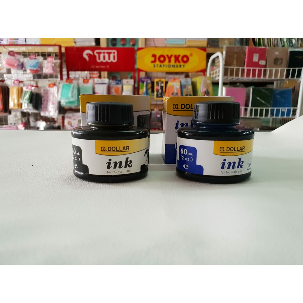 Tinta Botol Dollar / Dollar Fountain Pen Ink (60 ml)Made in PakistanTersedia 3 warna : - Royal Blue- Black- Red Rose Dapat digunakan untuk semua merek fountain pen. Made in PakistanPersediaan TerbatasHarap tanyakan dulu ketersediaan stock sebelum memesan, atau tidak akan kami kirimkan warna random/seadanya