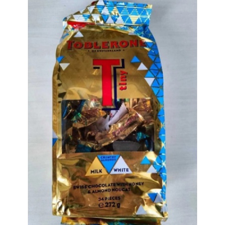 Toblerone Tiny Crunchy Almonds – one of the most successful flavors is now available in a new format! The iconic triangular milk chocolate with honey and almond nougat enriched with crunchy caramelized almonds and a drop of salt offered in a shiny, travel exclusive blue and golden bag of 34 individually wrapped snack-sized pieces. Perfect to share with your loved ones.