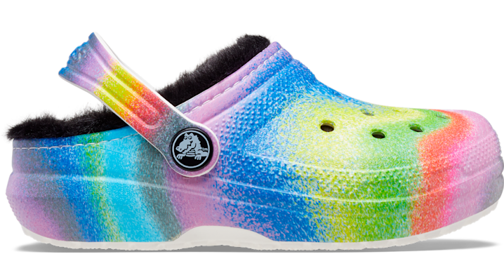 Little ones will love the fun colors, toasty warmth and iconic Crocs comfort in the Toddler’s Classic Lined Spray Dye Clog. The soft, fuzzy liner adds to the cushion and comfort, and the engaging print helps them show off their creative spirit. Choose between a spray dye print liner or spray dye print upper. Great as a slipper, yet very capable outdoors, too. Croslite™ foam construction keeps them light and easy to wear and the pivoting heel strap gives a secure fit. Grounded in comfort, spiked with personality. Toddler Classic Lined Spray Dye Clog Details: • The legendary Classic Clog, with a warm, fuzzy liner • Colorful spray dye print • Incredibly light and easy to wear • Pivoting heel straps for a more secure fit • Great indoors or out • Customizable with Jibbitz™ charms • Dual Crocs Comfort™: Blissfully supportive. Soft. Cradling comfort. • Fuzz Liner: Made of 100% Polyester