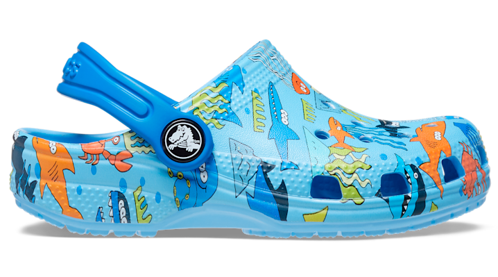 Little ones will enjoy the fun, summery graphics and iconic Crocs comfort in the Toddler’s Classic Pool Party Clog. Available in four vibrant prints: Cool Pineapple, Underwater, Ice Cream or Seashells. Croslite™ foam construction keeps them light and easy to wear. Grounded in comfort, spiked with personality. Toddler Classic Pool Party Clog Details: Fun, summery graphics on the uppers Incredibly light and fun to wear Ventilation ports add breathability and help shed water and debris Easy to clean and quick to dry Pivoting heel straps for a more secure fit Customizable with Jibbitz™ charms Iconic Crocs Comfort™: Lightweight. Flexible. 360-degree comfort.