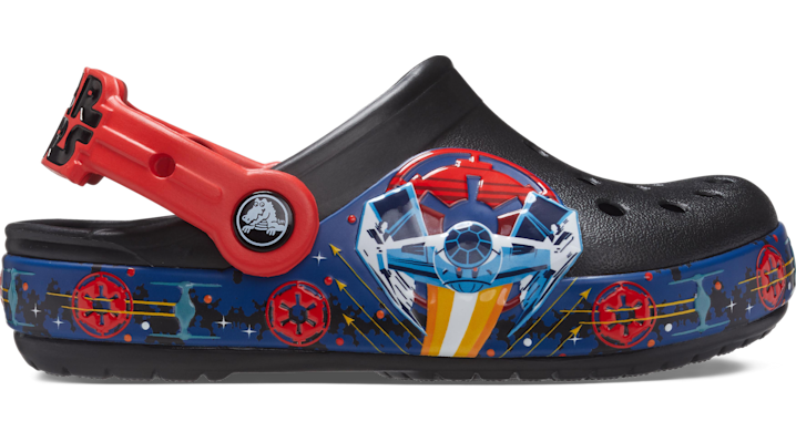 Real Fun Shoes For Real Fun KidsTake a walk on the Dark Side with scary-cool new Darth Vader clogs featuring light saber graphics around the band and powerful LEDs that light up with every step. Crocs Fun Lab styles feature original character-rich graphics, licensed characters from popular entertainments and other inspired designs to help kids express themselves and engage new friends. Toddler Fun Lab Darth Vader Lights Clog Details: Pivoting heel straps for a more secure fit Uppers featuring exciting new graphics and lights where kids can interact with them Customizable with Jibbitz™ charms Croslite™ foam outsoles for better traction, support and comfort Long-lasting LED lights; batteries are not replaceable Iconic Crocs Comfort™: Lightweight. Flexible. 360-degree comfort. © & ™ Lucasfilm Ltd.
