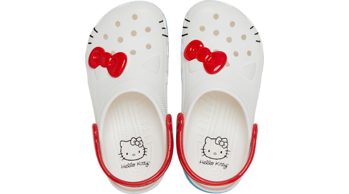 Get Hello Kitty for the little cuties in your life! Part of Hello Kitty’s 50th Anniversary Collection, this Toddlers’ Hello Kitty Classic Clog is inspired by the original Hello Kitty that debuted in her classic blue overalls and big red bow. © 2024 SANRIO CO., LTD. Used Under License. Hello Kitty IAM Classic Clog T Details: Fixed Hello Kitty ears and whisker graphics on upper Includes red bow Jibbitz™ charm Glossy pivoting heel straps for a more secure fit Hello Kitty logo on rivet and footbed Easy on, easy off Easy to clean and quick to dry Customizable with other Jibbitz™ charms Iconic Crocs Comfort™: Lightweight. Flexible. 360-degree comfort. Incredibly light and fun to wear Water-friendly and buoyant; weighs only ounces Ventilation ports add breathability and help shed water and debris