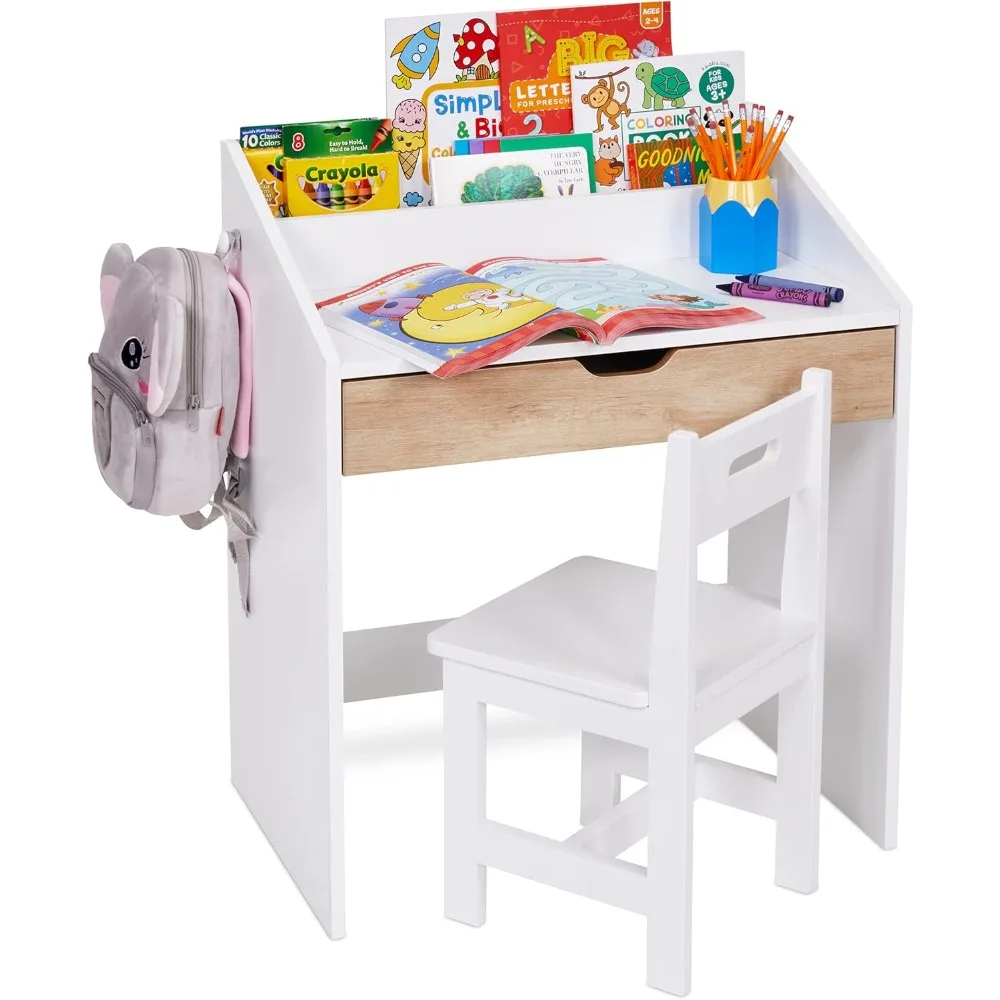 Toddler Study Desk and Chair Set for Home School Learning, Wooden Writing Table with Storage Drawer and Tablet Holder