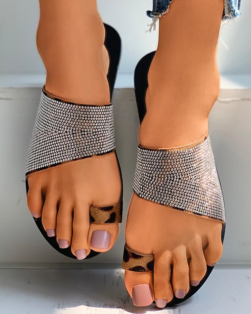 Toe Ring Rhinestone Solid Cheetah Pattern Flat Sandals, Leopard