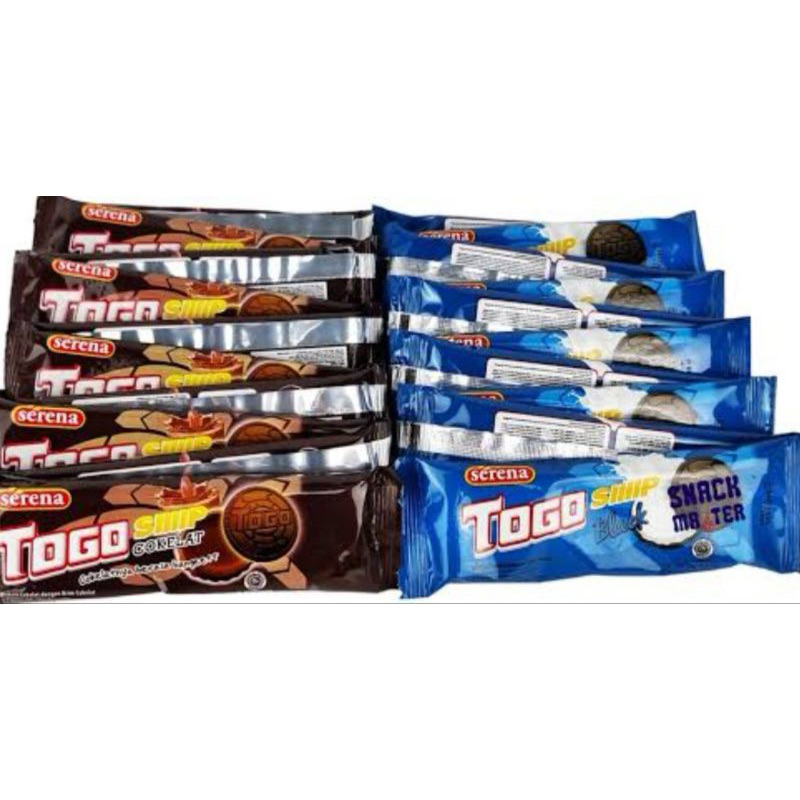 Togo Biskuit Renterng tersedia 2 pilihan rasa,,, coklat dan Black cream vanila, di jual per 1 Renteng isi 10 bungkus