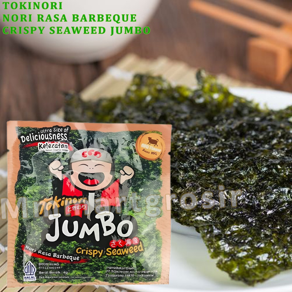 Tokinori jumbo adalah camilan ringan berupa rumput laut panggang yang diproses secara renyah dan dibumbui dengan rasa Barbeque (BBQ) yang gurih dan nikmat.Produk ini sangat cocok untuk penggemar camilan ringan yang mencari alternatif sehat dengan rasa yang tetap memuaskan.