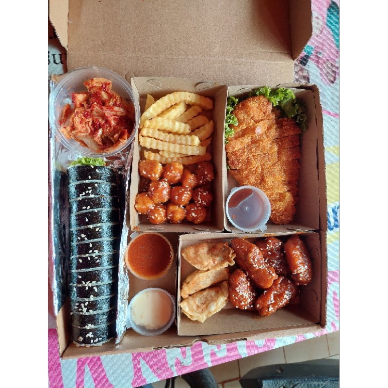 1 Box isi Kimbap Beef Bulgogi, Kimchi, Chicken Bites, French Fries, Chicken Katsu, Mandu dan Mini Chicken (Free Saus Garlic Mayo, Tonkatsu & Spicy + Alat Makan)