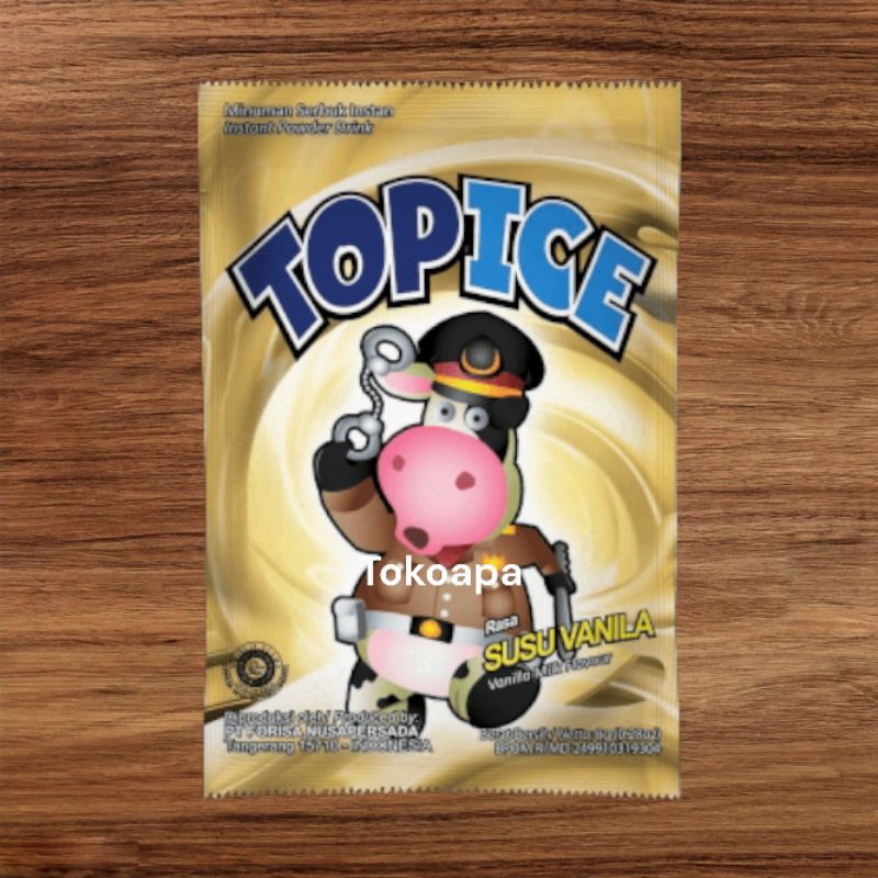 Top Ice adalah minuman serbuk instant yang dapat disajikan dengan berbagai cara seperti dihidangkan bersama dengan ES, dan dihidangkan dengan hangat atau tanpa menggunakan ES. Top ice merupakan salah satu produk minuman berupa susu bubuk beraromayang dikemas dalam kemasan praktis,menarik dan lucu.